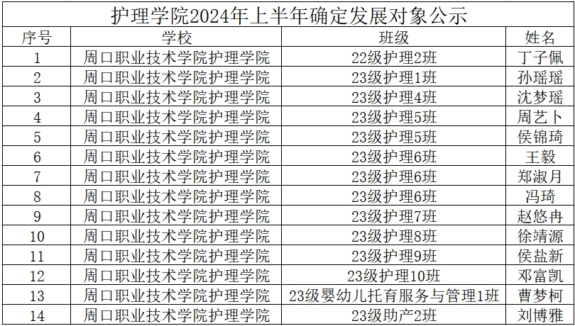 根据《中国共产主义青年团章程》有关规定,按照《中国共产主义青年团发展团员工作细则》和《中国共产主义青年团团员管理教育工作条例(试行)》要求,经本人申请、团支部推荐、组织审查考核、群众意见征集、培养考察,拟接收以下丁子佩、孙瑶瑶等14名同学为2024年上半年确定发展团员,现将名单予以公示:
