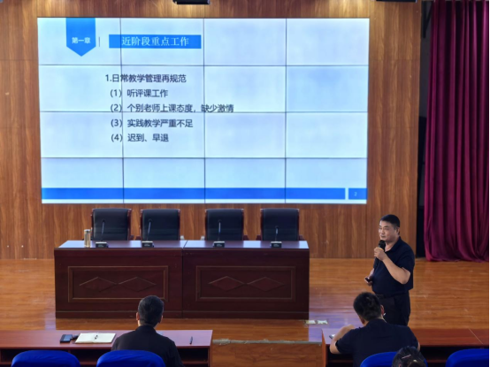孙先锋书记围绕新学期工作重点提出四点要求:一是号召全体教师加强学习,提升专业素养;二是全员参与学生就业工作,贯穿教学全过程;三是要筑牢校园安全防线,坚持以政治安全为根本;四是制定并落实新学期工作计划,确保教学工作有序开展。