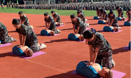 随着激昂的乐曲响起,一支身着迷彩服、佩戴红十字袖标的应急救护方队以整齐的步伐、响亮的口号步入会场。他们模拟战场救护场景,迅速对伤员进行头部帽式包扎、单胸包扎、前臂骨折固定悬吊、心肺复苏等急救处理,动作规范、迅速而准确,展示他们团队协作精神及应急处置能力。