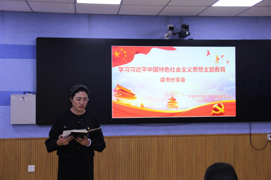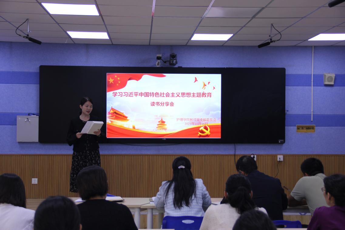 在分享环节中,教师党支部书记赵新首先分享了自己在阅读《习近平治国理政第四卷》中的感悟和体会。她从坚持实事求是,着眼大局;坚持“四个自信”,做好课程思政;坚持守正铸己,做有担当之人这三个方面全面阐述了作为党员教师的职责和使命。号召全体党员教师不忘初心、牢记使命,以德育人,为党、为国家培养高素质高技能护理专业人才。